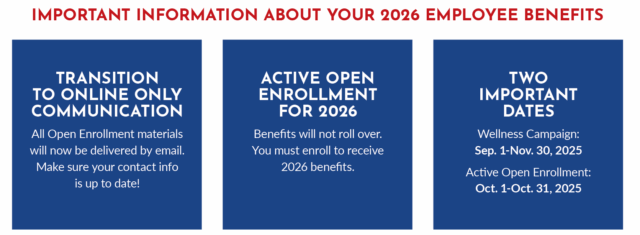 Open Enrollment for 2026 is active because benefit options are changing. This means all employees must make benefit selections during the enrollment period (October 1-31, 2025). If you don’t enroll, you will not receive benefits and coverage in 2026.
